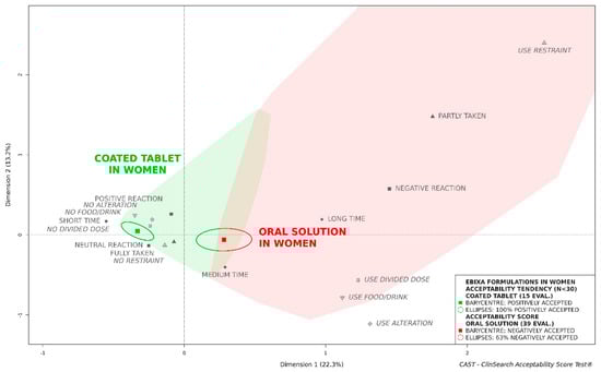In men, both formulations tended to be similarly accepted, the confidence ellipses of the coated tablet and the oral solution were overlapping. Conversely, the oral solution could not be considered as accepted in women, while the coated tablet tended to be classified as such (Figure 2). There were no significant differences between the groups of patients compared for both sexes, with the exception of more frequent polypharmacy in the women treated by tablet than in those treated with the oral solution (Table 1).