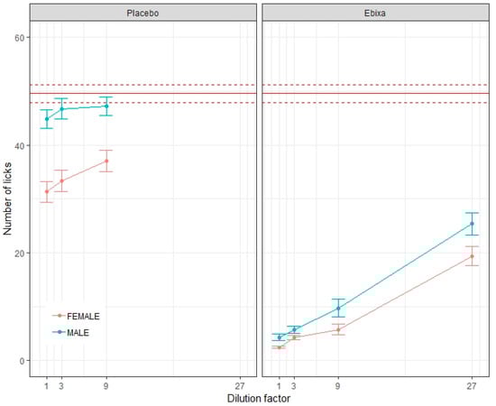 The aversiveness of test solutions for male and female rats. The average lick number for each dilution of placebo and original oral solution of memantine (Ebixa®) for male and female rats ± Standard Error of the Mean (SEM), with the average lick number of water shown as a solid red line ± SEM.