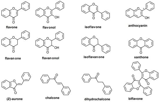 Flavonoids are a large group of natural substances derived from a 2-phenyl-chromone (flavone) nucleus, widespread in the green living world, from algae [,] to angiosperms [], although the ability of algae to biosynthesize flavonoids has been controversial []. The basic 2-phenyl-chromone nucleus consists of a diphenylpropane (C6–C3–C6) backbone, i.e., two phenyl rings (conventionally named A and B) connected by a small chain of three carbon atoms, forming a third ring with an oxygen heteroatom (ring C) [,]. There is a wide range of flavonoids in nature, subdivided into multiple classes. These are defined customarily based on the position at which the B-ring connects, the cycloid character of the C-ring, and the degree of oxidation: flavones, flavonols, flavanones, flavanonols, isoflavones, isoflavanones, anthocyanidins, flavanols, xanthones, aurones, chalcones and dihydrochalcones, and biflavones (Figure 1). As a side note, although furanochromones are sometimes included among the flavonoids [], they are not C6–C3–C6 compounds. Moreover, in a classical paper it was reported that furanochromones, although structurally close to furanocoumarins, are biosynthesized through acetate condensation and not on the phenyl-propanoid pathway [], making questionable the inclusion of furanochromones among flavonoids.