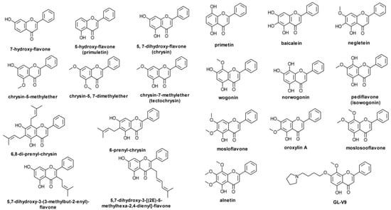 The most important such flavone aglycones, and the most widely studied up to now, are chrysin, baicalein, wogonin, and oroxylin A. Their number is larger, though, and using preliminary searches in PubMed, PubChem, Google Scholar, and a reference monograph [], we collected over 20 such compounds (Figure 2). Chrysin has been reported as an important component of propolis and honey, as well as of herbal extracts obtained from species of genus Passiflora [] or Alpinia oxyphylla Miquel []. Baicalein has been identified in several plant species to date, including Scutellaria baicalensis Georgi, Scutellaria lateriflora L., Scutellaria barbata D. Don, Oroxylum indicum (L.) Kurz, and the mushroom Tuber aestivum Vittad. (summer truffle) []. Wogonin may be extracted from species of Scutellaria, Andrographis, Anodendron [], Evodia [], or Carya [] genera. As baicalein and wogonin, oroxylin A is also an important component of Scutellaria species, but is also present in species of Oroxylum, Capparis, Ardisia, Stachys, and Eucommia genera []. GL-V9 is a synthetic derivative of wogonin, with antitumor activity shown in various in vitro models [], whereas BA-j is a synthetic derivative of baicalin (8-hydroxypiperidinemethyl-baicalein) with similar activity [].