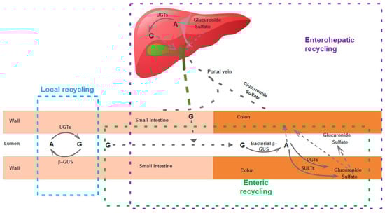 Schematic representation of different recycling scheme applicable to flavonoids. A: aglycones; G: glucuronide; β-GUS: β-glucuronidase; UGT: UDP-glucuronosyltransferases; ST: sulfotransferases.