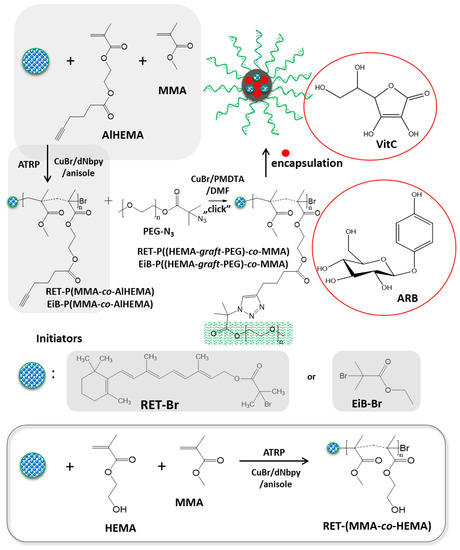 Pre-polymerization modification was applied to obtain the alkyl-functionalized monomer originating from HEMA, which was used for copolymerization via ATRP with bromoester initiators, including the modified retinol. The pre-polymerization strategy provided much better control of the number of alkyne groups in the copolymer, which could be modified into the amphiphilic graft copolymer via a “click” reaction between the alkyne functionality in the HEMA-based copolymer and the azide-functionalized PEG. The self-assembling behavior in aqueous solution at room temperature was employed to encapsulate ARB or VitC into micelles with a relatively high efficiency for almost all systems (DLC > 50%). In vitro release was carried out indicating the maximum amount of released ARB after 20 min (up to 5 h) and VitC after 10 min. With respect to both encapsulation and release studies, the PEG graft copolymers seem to be good candidates for potential delivery applications. The micellar systems with a short release time (up to 30 min) can be effective in face masks, whereas the other ones delivering bioactive substances over a longer time are perfect for cream applications. All these systems need to be tested for toxicity and diffusion through artificial skin to verify their application in cosmetology (masks, under-eye patches, and wraps).