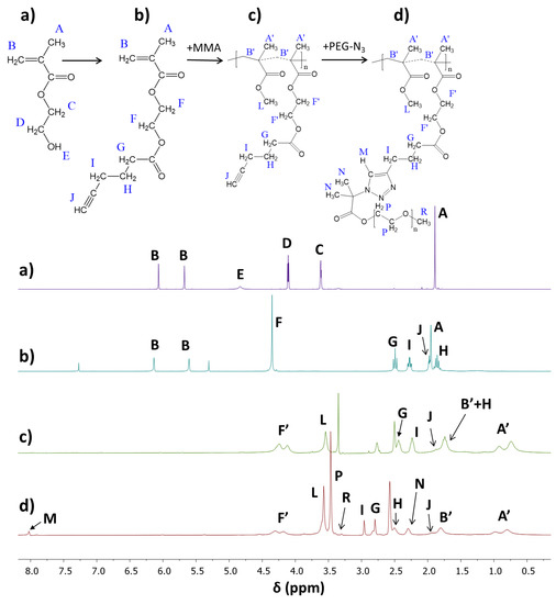 1H-NMR spectra of (a) HEMA, and (b) after its modification AlHEMA, (c) P(MMA-co-AlHEMA) V, (d) P((AlHEMA-graft-PEG)-co-MMA) Vc.