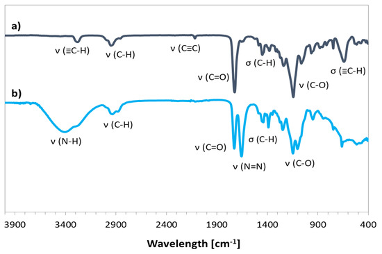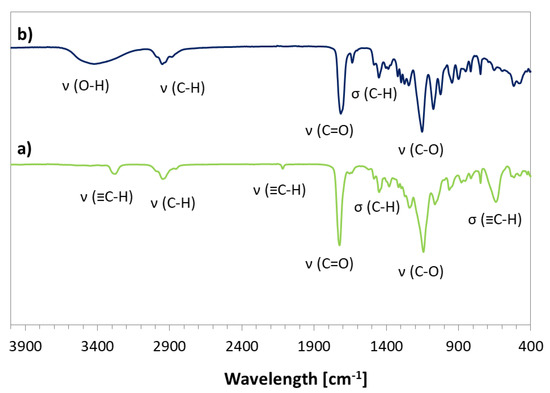 The prepared bromoester-functionalized retinol (RET-Br) and commercially available standard ATRP initiator, e.g., EiB-Br, were applied in the copolymerization of AlHEMA in the presence of a CuBr/dNbpy or CuCl/PMDTA catalyst system in anisole at 60 °C (Table 1). The range of initiators was broadened by RET-Br to develop the biocompatibility of polymers, but it also motivated characterizing its influence on the reaction rate and properties of the copolymers, including the structural parameters (i.e., degree of polymerization (DP), dispersity index (Ɖ)) in comparison to that obtained with the use of EiB-Br. The introduction of alkyne groups into monomer prior to the polymerization reaction guaranteed that the alkyne functionality was contained in all HEMA units incorporated into the polymer chain, whereas, in the case of the post-polymerization modification of HEMA-based polymers, it was strongly dependent on the esterification efficiency. The used strategy of pre-polymerization modification was beneficial for the adjustment of a certain number of alkyne groups in the copolymer by the initial proportions of AlHEMA/MMA comonomers (25/75, 50/50, 75/25). The alkyne moieties in copolymers were observed on the FT-IR spectra (Figure 3b) as peaks at 550–700 cm−1 and 3300 cm−1 from the bending and stretching vibrations of ≡C–H, respectively. It was in contrast to the hydroxy-functionalized polymers (Figure 3a), which revealed a broad band in the region of higher values of wavelengths corresponding to ν(O–H) stretching in HEMA units.