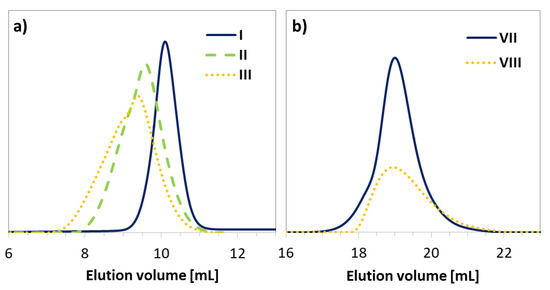 Dependent on the initiator (EiB-Br vs. RET-Br), the polymerization progress was characterized with different rates and total monomer conversions. The use of a standard EiB-Br initiator resulted in higher conversions within a shorter time compared to RET-Br (45% within 4.5 h vs. 25% within 24 h). However, the biological and non-toxic nature of the retinol starting unit can be beneficial for the improvement of skin treatment, whereas the resulting conversions are sufficient to obtain copolymers with the desired properties. In the case of HEMA polymerization initiated by RET-Br (Supplementary Materials Table S1), the reactions were significantly faster than the series of AlHEMA/RET-Br giving similar conversions in a shorter time (IV vs. VII = 23/22 vs. 18/18; VI vs. IX = 26/30 vs. 26/32 at 24 h vs. 0.5–4.5 h), which is rational due to more polar HEMA-based systems. The obtained copolymers were characterized by moderate dispersity indices usually exceeding 1.5, but their GPC traces were monomodal and symmetrical, showing some broadness and discrepancy with the increase in the content of alkyne or hydroxyl moieties (Figure 4).