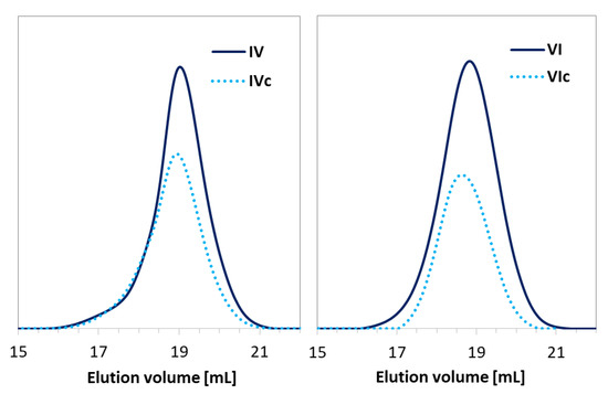 GPC traces for copolymers before (IV, VI) and after “click” reaction (IVc, VIc).