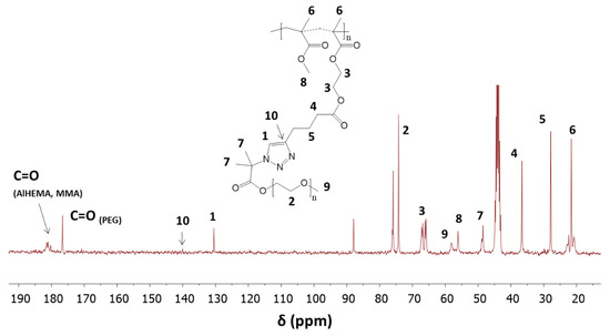 13C-NMR of graft copolymer P((HEMA-graft-PEG)-co-MMA) by “click” reaction.