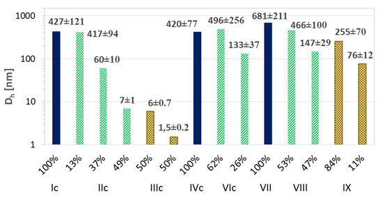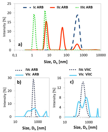 The resulting ARB or VitC encapsulated particles were analyzed by DLS in PBS solution (Table 3). Micelles containing ARB obtained from the grafted copolymers (Ic–VIc) were smaller compared to their linear counterparts (VII–IX). There was no significant effect for samples Ic and IVc differing with the initial unit (EiB vs. RET) and similar DG, which yielded one fraction of micelles; however, at a higher content of side chains, more fractions of the superstructures with different hydrodynamic diameters were observed (Figure 8). A few generations of loaded particles may indicate the presence of unimers, as well as the formation of micelles and aggregates (Figure 9, Supplementary Materials Figure S12). Similar correlations were detected for the systems based on the linear amphiphilic analogs, although the size differences were more spectacular.