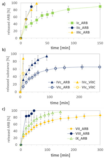 The release kinetics of ARB was also described by fitting to mathematical models, which were represented as semilogarithmic plots of remaining drug vs. time according to the first-order equation, and plots of the cumulative amount of released drug vs. square root of time according to the Higuchi model. Both types of plots (Supplementary Materials Figures S13 and S14) demonstrated good correlation coefficients, that is, 0.89–0.99 for Ic–VIc (graft copolymers), 0.93–0.99 for VII–IX (linear copolymers), 0.85–0.99 for Ic–VIc, and 0.87–0.96 for VII–IX. These results confirmed the concentration-dependent and diffusion-controlled mechanism.