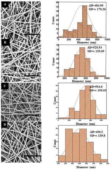 Scanning Electron Micrograph (SEM) (Right) and histogram (Left), (scale bar = 20 µm), (A) Poly (l-lactic acid-co-e-caprolactone)/Silk Fibroin (PLCL/SF), (B) PLCL/SF/2.5% Oregano Essential Oil (OEO), (C) PLCL/SF/5% OEO, (D) PLCL/SF/7.5% OEO.