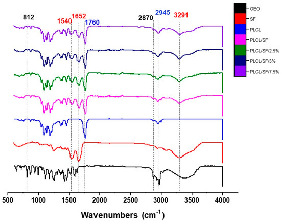ATR-FTIR spectra of pure OEO, SF, PLCL, and electrospun NF membranes containing 0%, 2.5%, 5%, and 7.5% OEO were obtained in absorption mode at 2 cm−1 intervals in the range of 500–4000 cm−1 using an ATR-FTIR spectrophotometer (Thermo Nicolet Avatar 380, Thermo Scientific, White Bear Photonics, White Bear Lake, Minnesota, USA).