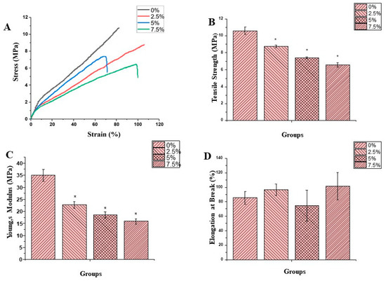 Figure 3A–D shows the mechanical properties of the fiber membrane in dry form. According to the results shown in Figure 3B, tensile strength of NF membranes with 0%, 2.5%, 5% and 7.5% OEO contents remained 10.61 ± 0.42, 8.76 ± 0.16, 7.40 ± 0.10 and 6.56 ± 0.28 respectively. All the OEO containing NF membranes exhibited tensile strength significantly different (p < 0.05) form control and decreased with increasing oil contents. The tensile strength of the PLCL/SF agrees with the previous work [14]. The decrease in tensile strength can be attributed to the oil contents attached to the surface resulting in a decrease in fiber strength. Moreover, porosity also increased with increasing oil contents which resulted in a relatively low tensile strength. This is probably the first study in which the incorporation of oil into the fiber membrane is studied in a mechanical point of view. However, all membranes fall in an acceptable range of mechanical strength required for skin tissue application. Figure 3C shows the Young’s modulus of the various membranes. The results indicated that values for the Young’s Modulus remained 34.94 ± 2.47, 22.71 ± 1.34, 18.53 ± 1.16, and 15.82 ± 1.02 for 0%, 2.5%, 5%, and 7.5%, respectively. Statistical analysis (p < 0.05) showed that all the oil containing fiber membranes are significantly different from the control. This decrease in Young’s Modulus can be linked to the decrease in tensile strength and an increase in the elasticity of the membrane due to the incorporation of oil into the NF membrane. The elongation at break of the dry samples are shown in Figure 3D. According to the data, the values for elongation at break remained 85.4 ± 8.7, 96.5 ± 8.1, 74.8 ± 21.5, and 101.3 ± 19.1 for 0%, 2.5%, 5%, and 7.5%, respectively. Although we can see some variation among various groups however, these variations are statistically insignificant. In general, OEO contents produced elasticity in the NF membranes.