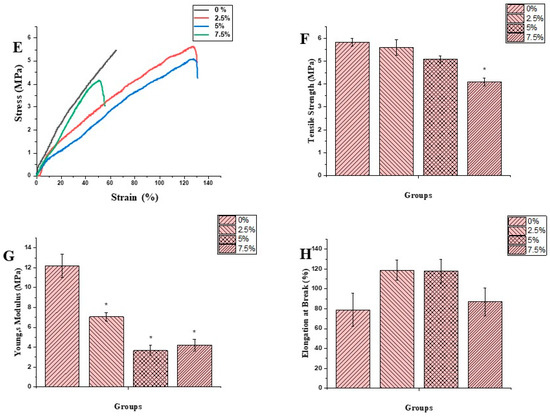 Figure 3E–H shows the typical stress-strain curve, tensile strength, Young’s modulus and elongation at break of the membranes in the wet state. The mechanical strength of the NF membrane was tested by immersion in PBS overnight, considering the wound environment. The result indicated the considerable mechanical strength even after immersing in PBS. According to the results, tensile strength for the membranes remained 5.82 ± 0.17, 5.58 ± 0.33, 5.08 ± 0.13, and 4.07 ± 0.16 for 0%, 2.5%, 5%, and 7.5%, respectively. Whereas the values for the Young’s Modulus remained 12.19 ± 1.18, 7.05 ± 0.40, 3.65 ± 0.52, and 4.20 ± 0.57 for 0%, 2.5%, 5%, and 7.5%, respectively. The elongation at break also remained under an acceptable range. However, in comparison to the dry state, this strength is significantly low. Similarly, the Young’s Modulus also remained proportionally lower compared to the dry state.