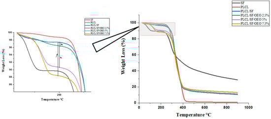 Thermogravimetric Analysis (TGA) graph of pure SF, PLCL and electrospun NF membranes with OEO (0%, 2.5%, 5% and 7.5%).