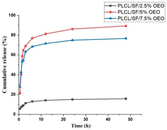 Cumulative release (%) of OEO from PLCL/SF/2.5% OEO, PLCL/SF/5% OEO and PLCL/SF/7.5% OEO.