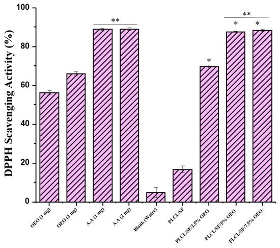 2,2-diphenyl-1-picryl-hydrazyl-hydrate (DPPH) scavenging activity of various samples for 30 min time. (* = significant difference in comparison with PLACL/SF, ** = non-significant with each other).