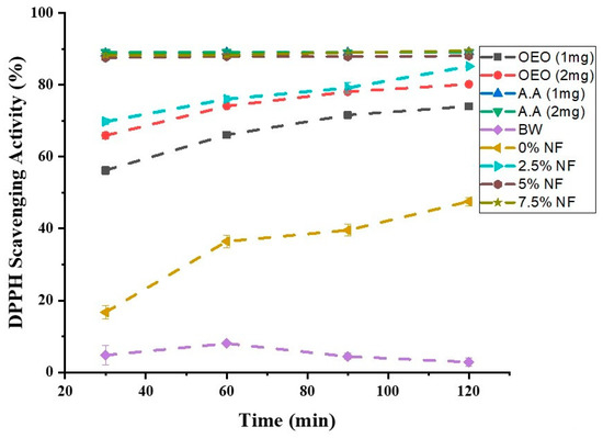 The experiment was also extended to check the time-dependent scavenging activity. Figure 8 shows that the antioxidant activity of various tested groups went up with time. But AA and NF membranes with 5% and 7.5% OEO contents showed complete scavenging activity within the first 30 min, arguing in favour of their maximum potential.