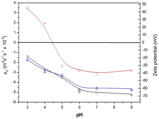 Electrophoretic mobility and zeta potential vs. pH in buffered media of low salinity (ionic strength equal to 0.002 M) for the different nanosystems: (black square) NP; (blue triangle) NP-BMP2; (red circle) NP-BSA-BMP2.