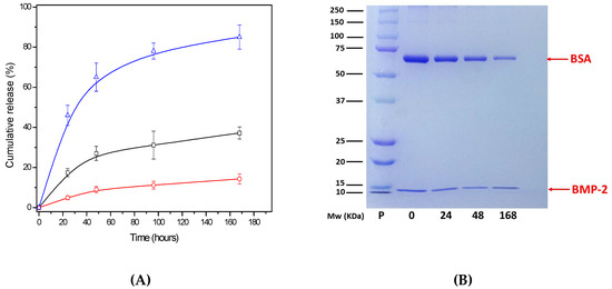 The release performance for the NP-BSA-BMP2 system, also shown in Figure 5A, presents notable differences. The electrokinetic profile has previously justified the surface location of BSA and rhBMP-2 on the surface, which could lead to a fast release of both proteins. However, results from Figure 5A,B show this trend only for the BSA protein that is released from NPs, with about 20% of the initial amount remaining after seven days. However, up to 90% of the initial load of rhBMP-2 protein, unlike BSA, remains attached to the surface. The NP surface with hydrophilic groups form poloxamer molecules and a negative charge due to the abundant presence of carboxylic groups (end-groups of PLGA and deoxycholic acid molecules) favor a desorption process for BSA, whose molecules have a negative charge under release conditions (physiological pH). This agrees with the results of other authors who, even after encapsulating BSA in PLGA-poloxamer blend NPs, achieved a fast burst release of above 40% to 50% of the initial protein amount [33]. Moreover, the co-encapsulation of albumins with growth factors could strongly affect its release profile, causing an initial burst [21,24]. Otherwise, the specific electrostatic attraction between positive rhBMP-2 molecules and negative surface groups slows down the short time release of this protein. This result is in agreement with the low release of adsorbed BMP previously found using PLGA micro- and nanoparticles with uncapped acid end groups [38,51]. Thus, the combination of different methods for trapping BMP-2 into and around NPs shows up the possibility of attaining a properly controlled release, balancing the interactions between polymers, stabilizers, and protein.