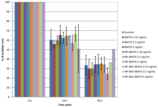 A cell-migration assay was conducted as previously described [26,27]. Briefly, MSCs were distributed on to three wells for each condition and allowed to grow to a cell confluency close to 99%, in 24-wells/plate at 3000 cells/cm2, and in each well three different scratches were made. Then, cells were starved for 24 h by adding culture medium without serum. A scratch was made using a pipette tip along the diameter of the well. A wash step with PBS was performed to remove the scratched cells. Fresh complete culture media was added and supplemented depending on the assigned group (BMP-2, NP- BMP2, and NP-BSA-BMP2 at 1.25, 2.5, and 5 ng/mL of BMP-2). Afterwards, nine images were taken from the same area in each condition until 48 h later. On these images, the scraped area was measured by ImageJ software (National Institute of Health, Bethesda, MD, USA; http://rsbweb.nih.gov/ij/). The reduction in the scratched area over time was measured considering the area at time 0 as 100% open.