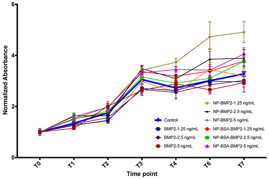 Proliferation was evaluated by a sulphorhodamine (SRB) assay [28]. The assay was conducted by seeding the cells at 1500 cells/cm2 in a 96-well plate at a confluence not higher than 50%. After cell attachment, the different supplements were added (BMP-2, NP- BMP2, and NP-BSA-BMP2 at 1.25, 2.5, and 5 ng/mL of BMP-2) and the cells were maintained in culture for up to 7 days. At each time point, the cells were washed with 1X PBS and fixed by adding ice-cold 10% trichloroacetic acid for 20 min at 4 °C. Then, the cells were washed 3 times with dH2O and dried until all time points were collected. Each well received 0.4% SRB in 1% acetic acid for 20 min at room temperature with gentle shaking. The staining was finished by washing each well 3 times with 1% acetic acid and drying it at room temperature for 24 h. The dye was retrieved from the cells by adding 10 mM Tris Base at pH 10.5 and gently shaking for 10 min. The solution recovered was then distributed in a 96-well plate and the optical absorbance was read at 492 nm.