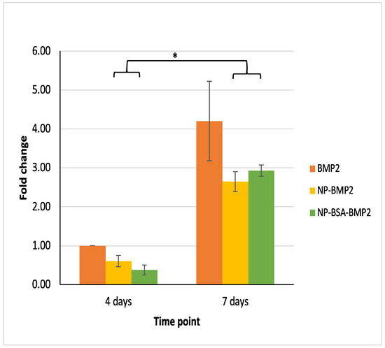 Relative fold change in the expression of ALP mRNA (control group: BMP2 at 4 days). * = Statistical significance of the comparison over time (p = 0.025 and p = 0.003, Student’s t test; NP-BMP2 and NP-BSA-BMP2 groups).