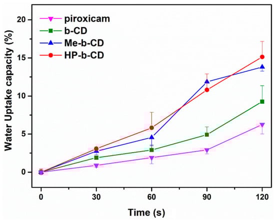 The water uptake results are illustrated in Figure 1. The capability of tablets to absorb water molecules was feasible to measure up to 2 min, as immersion in the medium for a longer time period resulted in erosion of the formulation. All the formulations showed an increase in weight due to water uptake. According to previous reports [14], complex formations could increase molecular mobility and release more sites for hydrogen bonding with water.