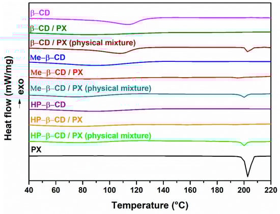 DSC thermograms of pure components and the various binary systems are shown in Figure 2. The curve of PX showed an endothermic peak at 202 °C, corresponding to the melting of a cubic crystal polymorph form (polymorph I) of the drug [15,22]. This endothermic effect was also evident in the thermogram of physical mixtures, indicating no interaction between drug and carrier in these systems. Thermal behavior of CDs showed dehydratation phenomena, seen as a wide endothermic peak in a different range of temperature for each cyclodextrins (β-CD 100–130 °C, Me-β-CD 70–110 °C, HP-β-CD 60–120 °C). β-CD binary complex showed, in the temperature 70–110 °C, the solvent exit seen as a wide endothermic peak shifted to lower temperature in RV products. The dehydration effect in the RV product with β-CD is shifted to lower temperature 70–100 °C, and appeared to be of lower intensity because of the dehydration due to the RV treatment. The disappearance of PX endothermic melting peak in the thermogram of the RV product can be attributed to the inclusion of drug in the cyclodextrin cavity [23]. DSC curve of the Me-β-CD complex showed, for each curve, the solvent loss in a range temperature between 70–110 °C. The shifting of the melting peak of the PX to a lower temperature, accompanied with enthalpy values reduction, confirmed the interaction of PX with CD and/or a partial amorphization of the drug [15]. Thermograms of HP-β-CD showed the same thermal profile of dehydratation (60–100 °C) seen in the previous system and the disappearance of the melting peak of the pure drug in RV products. Furthermore, these findings for RV products could show an in situ inclusion complex formation, according to other studies involving drugs inclusion complexes with CDs [24,25].