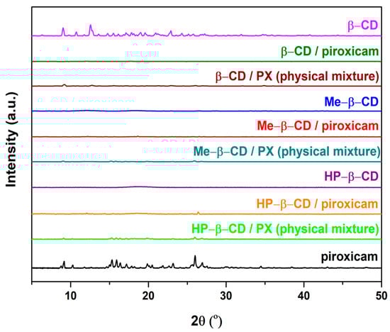 The X-ray diffractometry studies (Figure 3) confirm the crystalline nature of PX and β-CD, as well as the amorphous state of Me-β-CD and HP-β-CD. PX have a number of sharp peaks at 9.1°, 10.3°, 15.2°, 15.9°, 16.4°, 17.2°, 19.8°, 23.1°, 26.4°, and 27.1° [26]. Some of these peaks are already present in the diffractograms of physical mixtures, but appear of lower intensity compared to those of the pure drug. The diffractograms of the RV products showed no drug’s crystal signals, demonstrating the amorphous state of products probably due to their protection of PX in the cavity of CDs cyclodextrins. The results obtained in the current study are in agreement with previous studies reporting on the complexation of Hp-β-CD [14], Me-β-CD, and β-CD with PX [24].