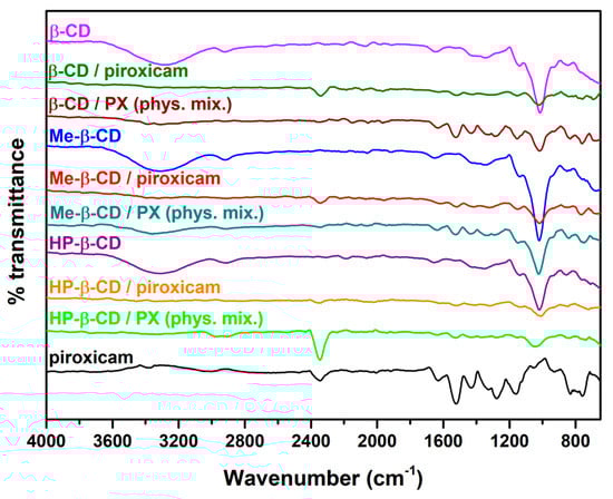 FT-IR spectra are illustrated in Figure 4. PX exhibits characteristic bands at 3330 cm−1 (-NH stretching), 2970 cm−1 (-OH stretching), and 1630 cm−1 (C=O group of the cubic form) [15]. The spectra of CDs present a profile without distinctly high peaks in the range of 3000–3700 cm−1 (–OH groups) and in the range of 2800–3000 cm−1 (C-H groups) [14,26,27]. Physical mixtures shows the presence of both components (PX and CD). The FI-IR spectra of native Hp-β-CD, Me-β-CD, and β-CD are in broad agreement with previous reported data [14,24], whereas characteristic peaks attributed to the presence of PXM are clearly visible in the dominant physical mixtures. In the case of the inclusion complexes, broadened peaks are the dominating features in the spectra in accordance with previous studies [14,24].