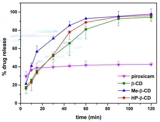The release profiles of PX from tablets are shown in Figure 5. A steep release of the pure drug was noticed. After 15 min about 40% of the initial amount of the drug was released attaining a plateau for the rest of the time period of the study. The release behavior of PX from tablets increases over time, resulting in prolonged release [14]. A total amount of about 96% was dissolved within 2 h (94% for β-CD, 96% for HP-β-CD, and 98% for Me-β-CD). The enhanced release rate of PX from tablets might be due to the decrease in crystallinity of inclusion complexes. The results demonstrated that the presence of cyclodextrins had no effect on the release rate of the active (t-test, p > 0.05).