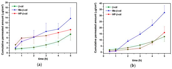 Table 3 shows the permeation parameters of the study and the permeation profiles are illustrated in Figure 6a,b. The rank order effect of the CDs for the transport of PX across buccal epithelium was Me-β-CD > HP-β-CD > β-CD [28]. However, only the values between β-CD and Me-β-CD were statistical different (t-test, p < 0.05). Lipophilic CDs, such as Me-β-CD, have the ability to remove lipids from cell membranes forming complexes. They also can act as permeation for drugs through the buccal mucosa [8]. However, β-CD may retain the drug onto the surface of epithelium. This rank order was also maintained for free complexes and tablets, but the value of the permeability coefficient in tablet form was approximately 3-fold higher than that measured for every CD t-test at p < 0.05. This result is due to the presence of chitosan which might have a synergistic effect with cylcodextrins resulting in an enhanced permeation of PXM across porcine buccal epithelium compared to the free complexes, for all types of CDs tested.