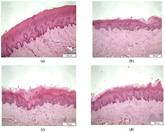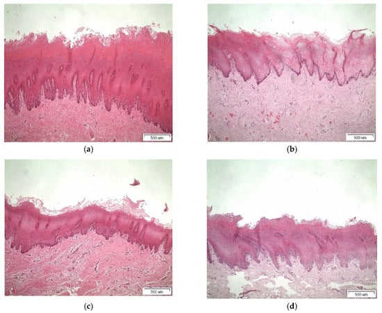 Light micrographs of porcine buccal tissue after 5 h treatment with binary systems and tablets are shown in Figure 7 and Figure 8, respectively. For β-CD in Figure 7b and Figure 8b, mild desquamation of superficial epithelium was observed. Detachment of the epithelium from underlying stroma and mild disorganization at basal membrane are illustrated in the micrographs of Figure 7c and Figure 8c for Me-β-CD, with only rare acantholysis and inter-epithelial gaps in tablet form. In Figure 7d and Figure 8d, desquamation of superficial keratinocytes and mild disorganization of collagen beneath basal membrane could be identified for HP-β-CD [3,8,29]. The loss of the superficial cell layers might imply interactions between the CDs and the epithelial lipids given that CDs can induce lipid solubilization [30]. The histological findings show swelling when permeation enhancers are present and the effect of CDs further corroborated the ex vivo results. The results obtained from the histological evaluation further corroborate the in vitro permeation, where in the case of free complexes, the highest transport of PXM were recorded for Μe-β-CD, accompanied by extended detachment of the superficial layers compared to its congeners β-CD and Hp-β-CD. This might be attributed to the affinity of lipophilic cyclodextrins to biological barriers, altering the membrane permeability by opening the tight junctions. In a similar manner the same pattern was observed for the tablets as well.