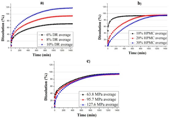 Average dissolution profiles sorted by (a) DR content; (b) HPMC content; (c) compression force.