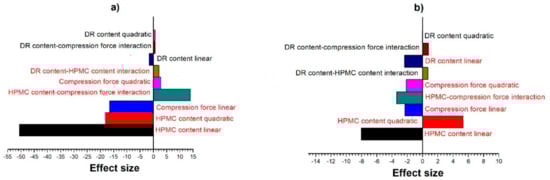 The effect of the three parameters on the dissolution measured at 15 and 960 min was analyzed as a 33 full factorial experimental design. The Pareto chart of the standardized effects on the dissolution at 15 min is displayed in Figure 2a. It is clear that HPMC content had the most significant effect, as its linear and quadratic terms had the two largest values. This result was not surprising, considering the fact that HPMC was added to the tablets to control the release of DR. When the concentration of HPMC is high enough, upon contact with water it forms a geling polymer network [53] and drug molecules reach the dissolution medium via diffusion through this layer. The compression force was also significant, as well as its interaction with the HPMC content. DR content had only a marginal effect at 15 min, that is, at the initial phase of the dissolution. The results were quite similar after 960 min (Figure 2b). HPMC level was still the dominating factor, but the relative importance of compression force decreased. At this point, the relative influence of DR content increased, and it became a significant factor with an effect similar to the compression force. The results of the experimental design show that a model that aims to predict the dissolution profile of these tablets needs to consider all three factors to determine the shape of the dissolution curve, while DR content was also vital in predicting the maximum dissolution achieved. It can be also concluded that for surrogate modeling of dissolution, all these factors need to be characterized accurately, for which tasking a single data source might not be sufficient.