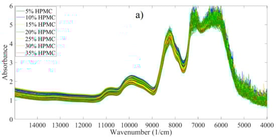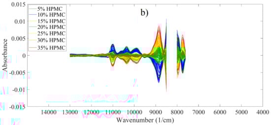 The spectra provided noisy signals in the region below 7600 and at the 8000–8500 cm−1 band because of the high absorbance; therefore, these regions were excluded before further preprocessing steps. The first derivative of the spectra was calculated, as this process improves information extraction in cases when the signal of interest is contained in the sharper, narrower peaks of the spectrum. Multiplicative signal correction was applied in order to normalize the spectra and to remove the baseline offset, helping to remove differences between the spectra caused by multiplicative and additive effects during the collection of spectra. Mean centering was used before calculating the PCA model. The preprocessed spectra are shown in Figure 3b. After preprocessing, the samples with different HPMC contents could be clearly distinguished based on the different peak absorbance values. HPMC content correlated negatively with the intensity of peaks at 11,000, 10,300 and 9800 cm−1, and positively with the peaks at 8850 and 7750 cm−1.