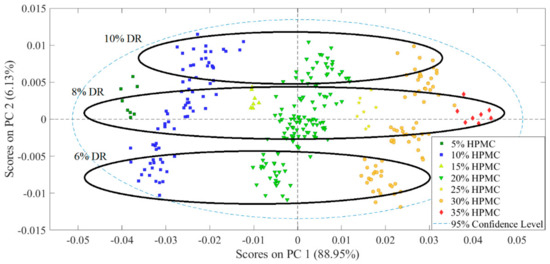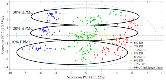 A PCA model with two PCs was built based on these spectra. The first PC, responsible for 55.22% of the total variance, represented the DR content, while the second PC (10.35% variance explained) was associated with HPMC content. The score plot of these two PCs is shown in Figure 6. The samples with different DR content form distinguishable groups along the first PC, although the distance between the groups is smaller than in the case of HPMC content measured by NIR transmission. The loading plots are shown in Figure S2.