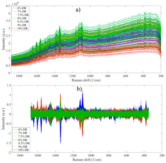 The raw Raman transmission spectra are presented in Figure 5a. The region above 1680 cm−1 was noisy and below 350 cm−1 a steep slope can be observed, which was caused by fluorescence. These regions were excluded before further examination of the data.