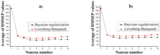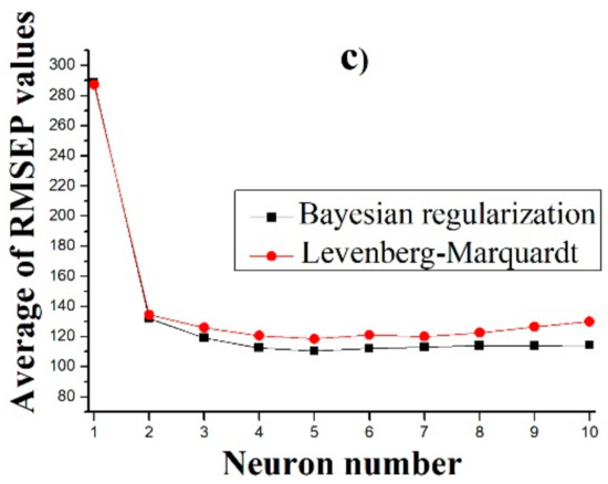 The average RMSEP values of the ANN models using three different validation input datasets are shown in Figure 7. The results show that one neuron yielded poor performance, yet the addition of a second neuron greatly improved the models. Adding further neurons was beneficial until five neurons, in the case of Raman and NIR-Raman input, or four neurons, in the case of NIR input. Error of models slightly increased after this threshold, implying that four or five neurons were enough to describe the behavior of this system, with more neurons only leading to overfitted models. It was also clear that Levenberg–Marquardt-based ANNs were worse in all cases when compared with Bayesian regularization models, although the latter took a longer time to train (with 10 neurons, 100 training steps took around 20 min for Bayesian regularization and 5 min for Levenberg–Marquardt); this difference in training time does not justify using Levenberg–Marquardt. The models with the lowest RMSEP value were chosen for further evaluation (five neuron models for Raman and NIR-Raman and four neuron models for NIR). The predictive ability of these models was compared to prediction yielded by a PLS model built using the same data and using the same input for validation. The predicted dissolution profile of these models was compared to the measured profiles by calculating the f2 value. Table 4 shows this comparison, with ANN models outperforming PLS models in all cases.