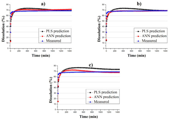 Average of predicted (PLS and ANN) and measured dissolution profiles of Formulation 1 tablets where predictions were based on (a) Raman, (b) NIR and (c) Raman and NIR spectra.