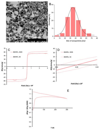 BMNPs exhibited well-developed faces and a size ranging from 20 to 50 nm, with an average crystal size of 35 ± 8 nm, according to TEM analyses (Figure 2A,B). The hysteresis loop of BMNPs showed a typical ferromagnetic behavior at 5 K, while at 300 K, these nanoparticles showed zero coercivity, which indicates their superparamagnetic character, being that the magnetization saturation (Ms) was at 300 K 55 emu/g (Figure 2C,D). The ZFC-FC curves at 500 Oe show a slow increase in magnetization (Figure 2E). In fact, the TB was 150 K for BMNPs. According to Prozorov et al. [17], this higher TB and slow magnetization increase is related to particles that expose a large magnetic moment per particle and high crystallinity.