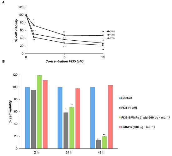 HepG2 cells were seeded onto 96-well plates (10000 cells/well) and grown in MEM/10% FBS for 24 h. After 24 h, the medium was removed and 100 μL of fresh medium containing Ff35 (1, 5, and 10 µM), BMNPs (300 µg mL−1), or Ff35-BMNPs (Ff35 1 μM and BMNPs 300 µg mL−1) were added for different times. Cell viability was assayed by the MTT (3-(4,5-dimethylthiazol-2-yl)-2,5-diphenyltetrazolium bromide). Formazan crystals were dissolved in 100 μL of DMSO, and the absorbance was read at a wavelength of 570 nm using a microplate reader (HTX Microplate Reader BioTek Instruments, Winooski, VT, USA). The GI50 (half-maximal growth inhibitory concentration) value was determined from the % cell viability at different concentrations of synthetic inhibitor by using a sigmoidal dose-response curve (the ED50plus v1.0 software), referencing this value to an untreated cells control taken as a 100% of the viability.
