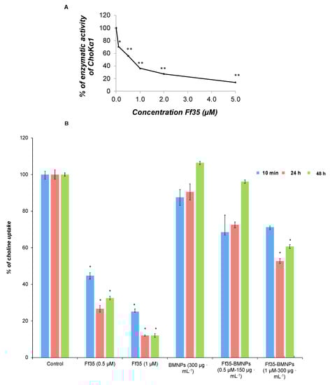 (A) Effects of Ff35 on ChoKα1 activity assayed in purified ChoKα1 exposed to different Ff35 concentrations. The results are expressed as percentage of enzymatic inhibition. (B) Choline uptake assay in HepG2 cells. Choline uptake was determined in cells treated for 10 min, 24 h, and 48 h soluble Ff35 or Ff35-BMNPs. Results are normalized to their respective control. These experiments were performed three times in triplicates. * p < 0.05, ** p < 0.001 compared to their respective controls.