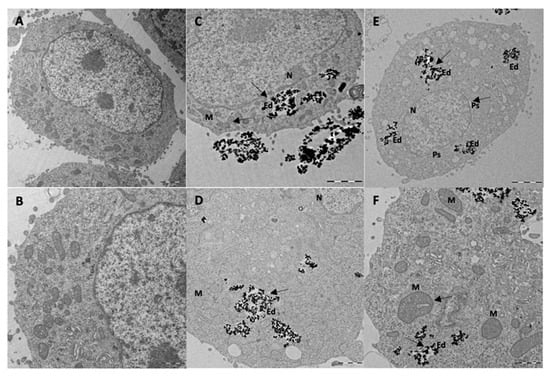 Internalization of BMNPs and Ff35-BMNPs. Ultrastructural alterations produced by Ff35-BMNPs. (A,B): Control HepG2 cells. (C,D): HepG2 cell exposed to BMNPs has ultrastructure similar to control cells. (E,F): Treatment with Ff35-BMNPs (concentration of BMNPs was 300 µg mL−1 and Ff35 was 1 μM). Perinuclear space (Ps) is visible. The two nuclear membranes were separated showing a dilatation of the Ps. It is notably mitochondrial (M) rarefaction, disorganization, and dilatation. Both BMNPs and Ff35-BMNPs were internalized by HepG2 cells via endocytosis and compartmentalized in endosomes (Ed). Scale bar corresponds to 2 µm (A,C,E) and 1 µm (B,D,F).
