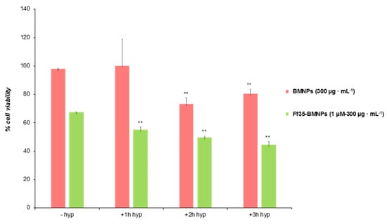 We consider now the effect of hyperthermia and the combination hyperthermia-Ff35 on cell proliferation. In all cases, the HepG2 cells were subjected to the magnetic field for periods of 1, 2, and 3 h. We assume that, according to generally accepted results, tumor cells are more sensitive than healthy ones to a temperature increase [26], and, although 43 °C is widely accepted as a common threshold for apoptosis of various cancer cells, many reports indicate that different thermal sensitivities exist among different cell lines [27]. Hence, preliminary experiments aimed at setting the optimal conditions of hyperthermia in HepG2 with the used BMNPs either bare or functionalized with Ff35. Figure 7 shows the effect of hyperthermia on the viability the cells, in comparison with cells not subjected to the magnetic field. Hyperthermia reinforced cytotoxicity on both cells treated with BMNPs and, much more so, on cells treated with Ff35-BMNPs. As it can be observed, after 2 h (and also 3 h) of hyperthermia regime there was a significant decrease in viability (73% after 2 h and 79% after 3 h) of cells maintained in the presence of BMNPs and AC field, revealing the cytotoxic effect of hyperthermia. However, there were not significant differences between these two different times. On other hand, significant differences in viability were found when the cells were treated with Ff35-BMNPs, with and without field. It is shown in Figure 7 that the viability of cells treated with Ff35-BMNPs without hyperthermia reached 67%, these values being lower in those cells treated with Ff35-BMNPs with hyperthermia (54.8% for 1 h, 49.7% for 2 h, and 44.5% for 3 h). Since BMNPs are cytocompatible, these results show that the temperature rise induced by them upon application of an alternating magnetic field was responsible for the reduction in cell viability. However, such reduction was more evident and faster upon the combination of drug release and hyperthermia. It is proposed that hyperthermia may not only increase the local temperature, but also trigger the release of Ff35 from the BMNPs in the cells, as already demonstrated to occur for other compounds [28].