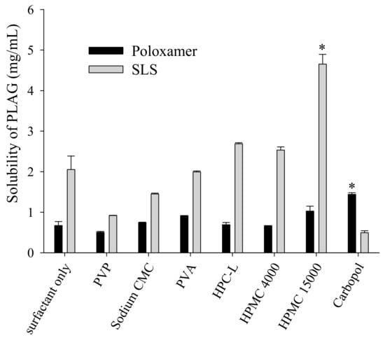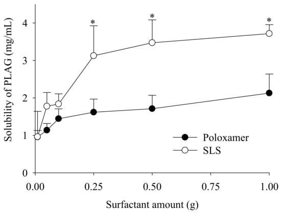 Firstly, for the selection of a solid surfactant in the present study, poloxamer (non-ionic) and SLS (anionic) were evaluated for their ability to increase the solubility of PLAG (Figure 2). SLS was selected because it showed a better solubility of PLAG as compared with poloxamer. Moreover, the solubility of PLAG increased as the amount of SLS increased; however, there was no further significant increase in drug solubility with an increase of SLS from 0.25 g to 1.0 g. SLS causes gastrointestinal adverse effects at a high oral dose [25]: thus, 0.25 g SLS was chosen due to its sufficient solubility at a lower quantity.