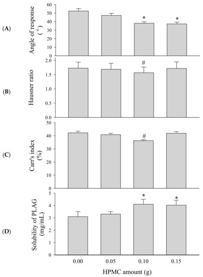 Effect of HPMC amounts on the flow ability and solubility of self-emulsifying granule system (SEGS). Each value represents the mean ± SD (n = 3). * p < 0.05 compared with HPMC amount (0 and 0.05 g); # p < 0.05 compared with HPMC amount (0, 0.05, and 0.15 g). (A) Angle of repose; (B) Hausner ratio; (C) Carr’s index; (D) solubility.
