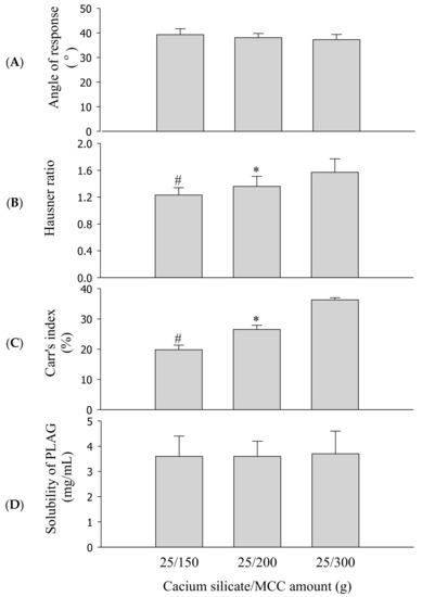 Effect of calcium silicate/microcrystalline cellulose (MCC) amounts on the flow ability and solubility of SEGS. Each value represents the mean ± SD (n = 3). * p < 0.05 compared with calcium silicate/MCC amount (25/300 g); # p < 0.05 compared with calcium silicate/MCC amount (25/200 and 25/300 g). (A) Angle of repose; (B) Hausner ratio; (C) Carr’s index; (D) solubility.