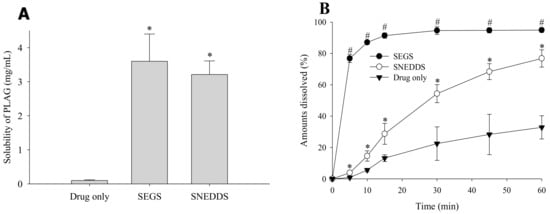 Drug solubility (A) and dissolution profile (B) of SEGS and SNEDDS in the pH 6.8 buffer containing 2.5% SLS. The SEGS and SNEDDS were composed of PLAG/SLS/HPMC/calcium silicate/MCC at the weight ratio of 1:0.25:0.1:0.5:3. Each value designates the mean ± S.D. (n = 6). * p < 0.05 compared with drug only; # p < 0.05 compared with drug only and SNEDDS.