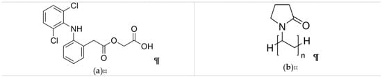 The active pharmaceutical, aceclofenac (Figure 1a) was provided by Richter Gedeon Plc. (Budapest, Hungary). For the preparation of the viscous polymeric solutions, poly(vinyl-pyrrolidone) (PVP K90, Kollidon K90, Figure 1b) was used, which was obtained from Sigma Aldrich (Merck, Darmstadt, Germany). Triethanolamine (trolamine) and ethanol were from Molar Chemicals (Budapest, Hungary). Ultrapure, distilled water was prepared in-house by a MilliQ water purification system. Potassium dihydrogen phosphate and disodium hydrogen phosphate (Merck KGaA, Darmstadt, Germany) were employed for the preparation of the phosphate buffer solution (1 M, pH 6.8) used for the in vitro dissolution study.